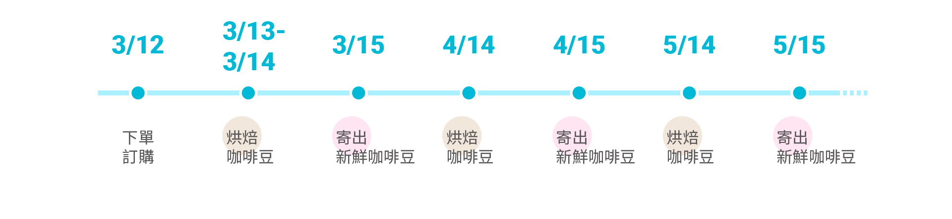 舉例:小啡3/12日訂購6個月1+1自由配方案,川咖啡將於3/15、4/15、5/15、6/15、7/15、8/15各寄出2包新鮮烘焙咖啡豆。